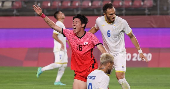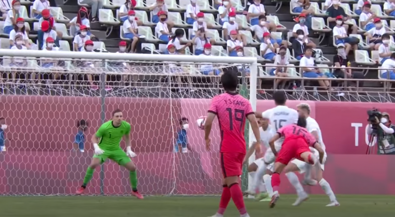 볼은 빠르게 문전으로 향했고, 이를 저지하려던 루마니아의 중앙 수비수 마리우스 마린의 오른발을 맞고 자책골이 됐다. 도쿄올림픽에 나선 김학범호의 첫 득점이었다. 선제골 이후 곧바로 위기가 찾아왔다. 전반 32분께 상대 공격수의 압박을 받던 원두재가 골키퍼 송범근에게 백패스를 했고, 이 과정에서 송범근이 상대 선수의 발을 맞고 온 것으로 착각해 볼을 손으로 잡았다. 순간 주심은 이를 백패스로 인정해 골지역 정면에서 루마니아의 간접 프리킥을 선언했다.