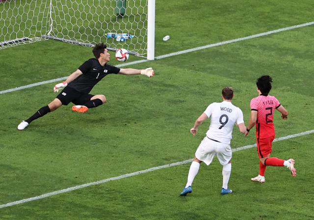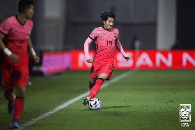 전반 24분에도 왼쪽 중원에서 이동경이 투입한 프리킥을 공격에 가담한 정태욱이 페널티지역 오른쪽에서 헤더로 골을 노린 게 크로스바를 넘어가며 뜻을 이루지 못했다. 가슴 졸였던 한국의 선제 득점은 전반 27분 상대 자책골로 터져 나왔다. 중앙선부터 빠르게 공격에 나선 한국은 오른쪽 측면에서 볼을 이어받은 이동준이 골지역으로 쇄도하는 황의조를 향해 빠르고 날카로운 크로스를 시도했다.
