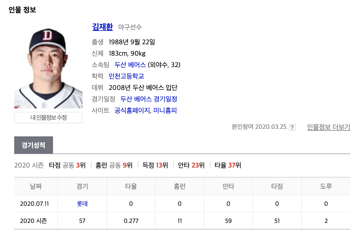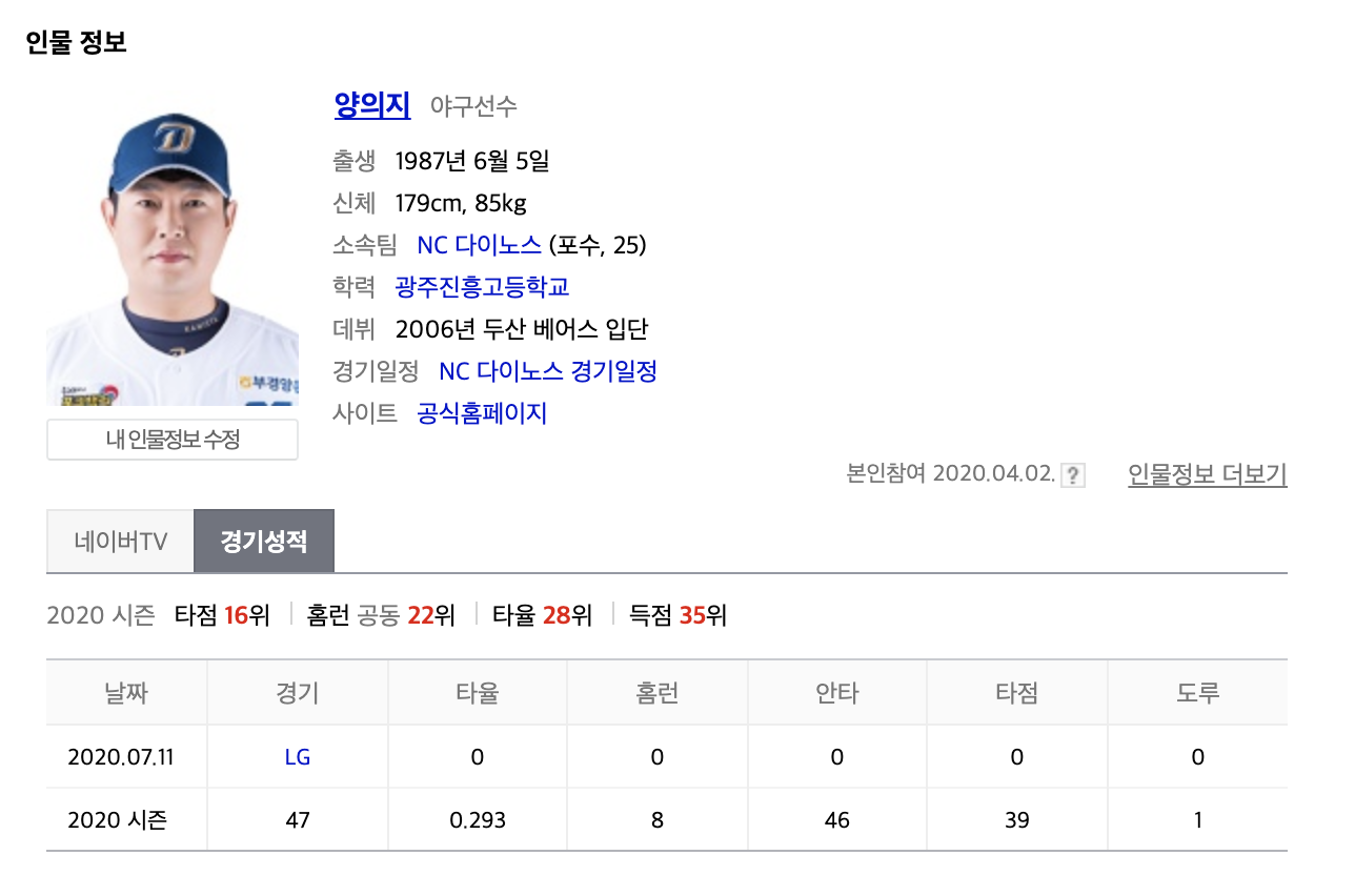 포수이지만 굉장히 좋은 타격 능력을 바탕으로 꾸준히 선전하고 있는 선수입니다. 경기의 흐름을 읽는 능력이 탁월하여 국가대표 주전 포수를 맡고 있습니다. 양의지 선수가 연봉 공동 3위입니다.