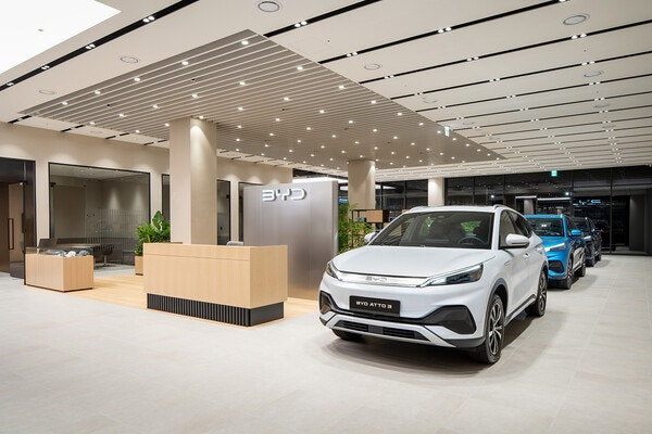 가장 먼저 맞이해준 모델은 스키 화이트 컬러의 2025년형 BYD 아토 3 시승차이며, 이어 중형 전기 세단 2025년형 BYD 씰 전시 차량이 준비되어 있어 전시장의 시선을 사로잡습니다.